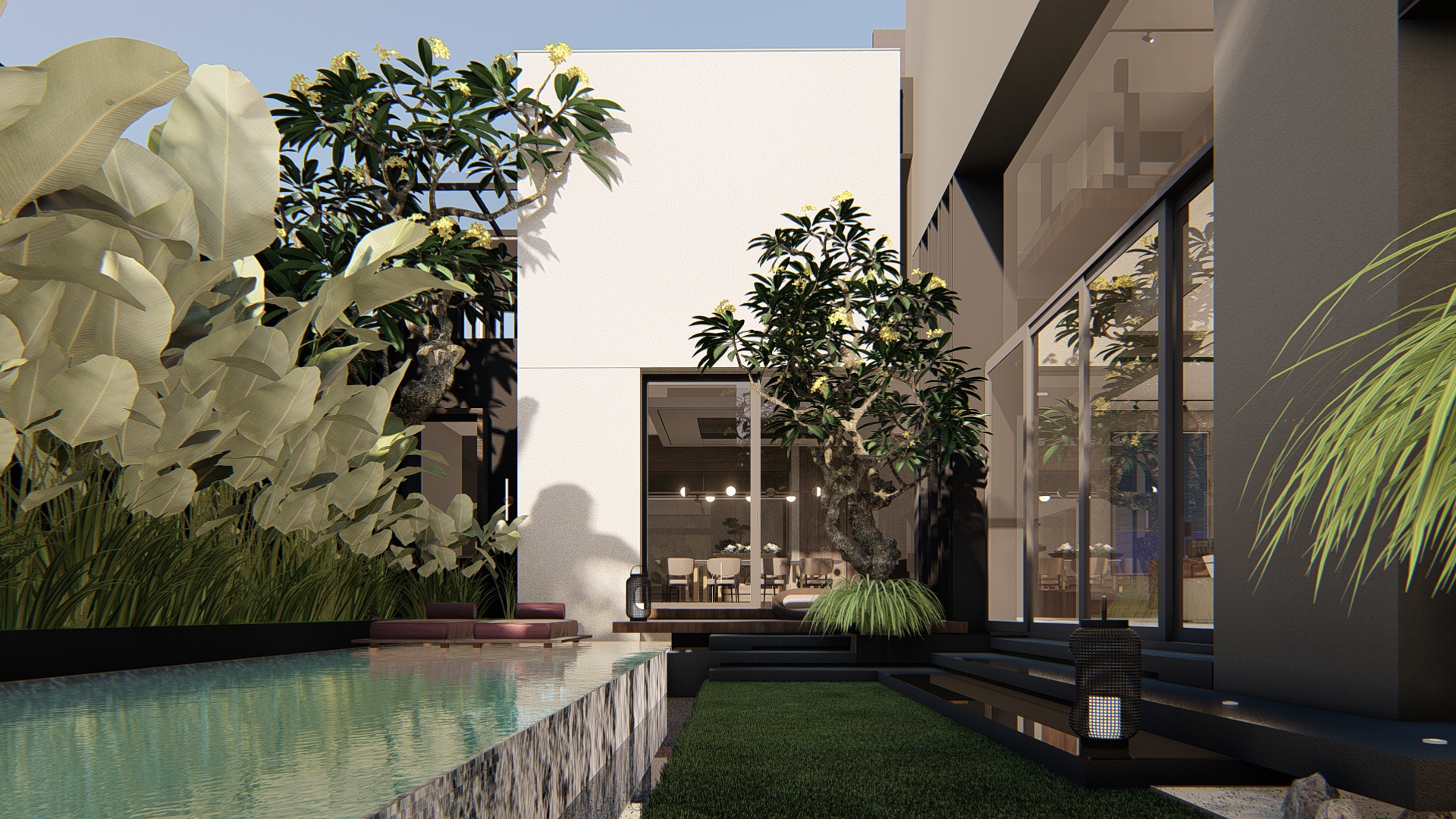 A defining feature of AV Residence is the expansive courtyard that links all ground floor spaces. This large, meticulously designed area incorporates lush gardens, a sunken deck, and a refreshing swimming pool. The courtyard serves as a harmonious transition between the indoor and outdoor, offering a serene backdrop for social interactions and private retreats.